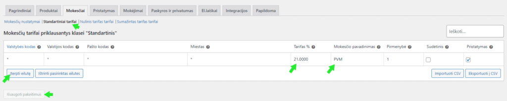 Eikite į: WooCommerce > Nustatymai > Mokesčiai > Standartiniai tarifai