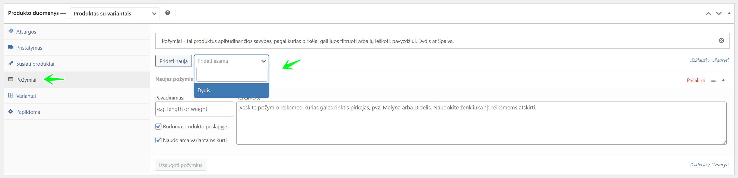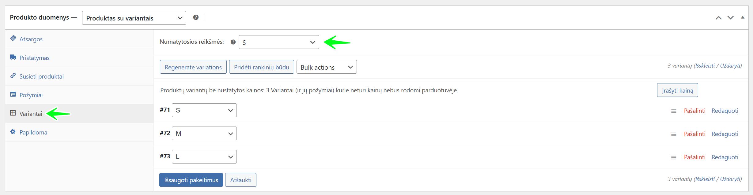 Produkto su variantais nustatymai: