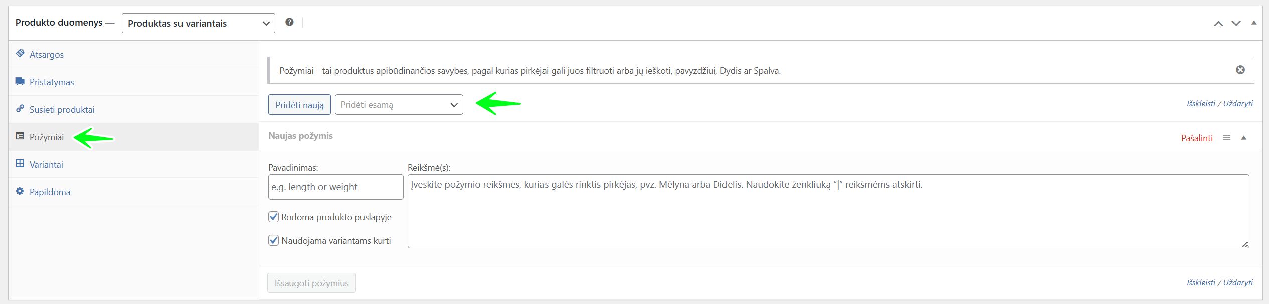 - Kairiajame meniu eikite į Produktai -> Požymiai.