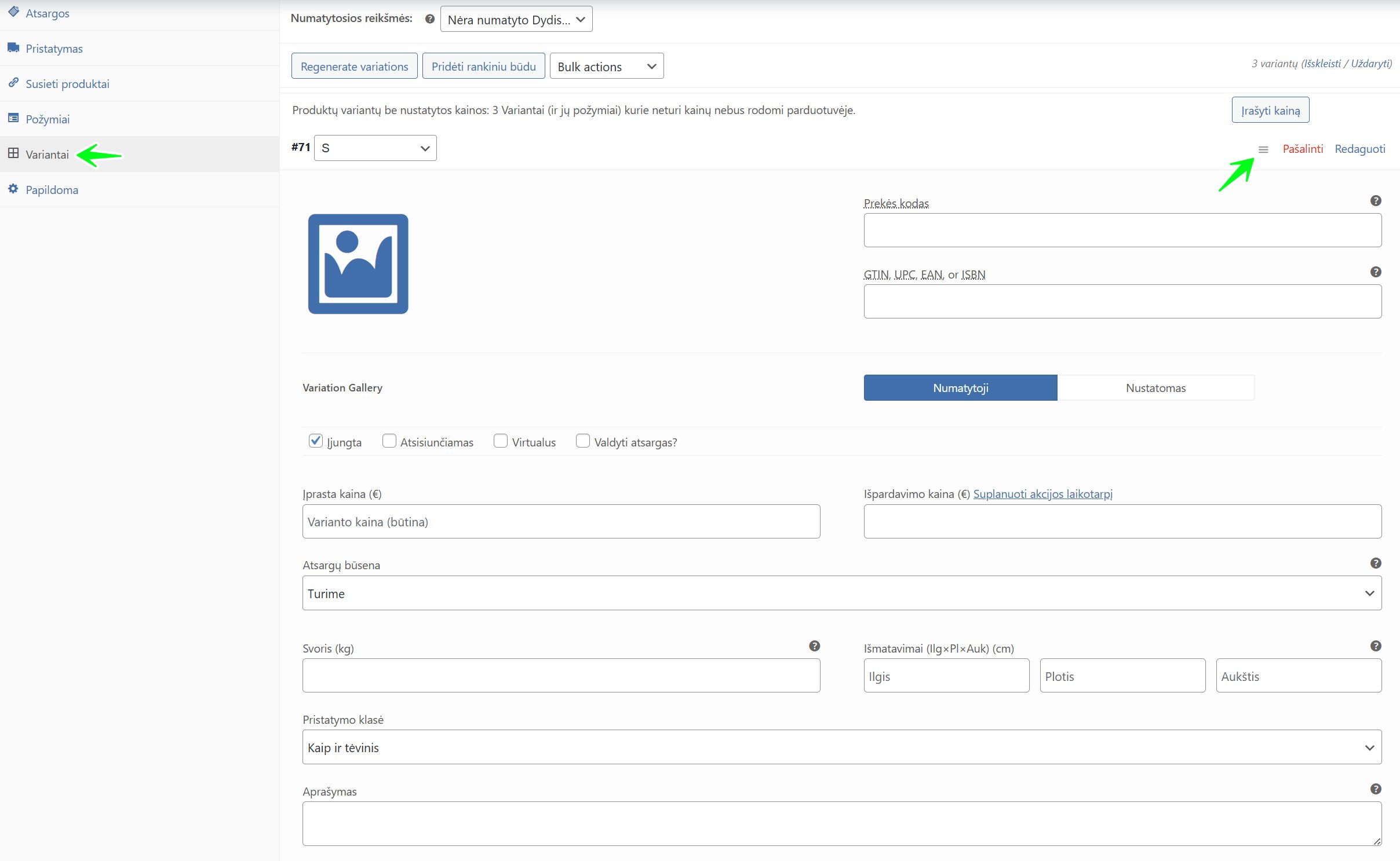 - Prekės kodas (SKU): Įveskite unikalų prekės kodą būtent šiam variantui.