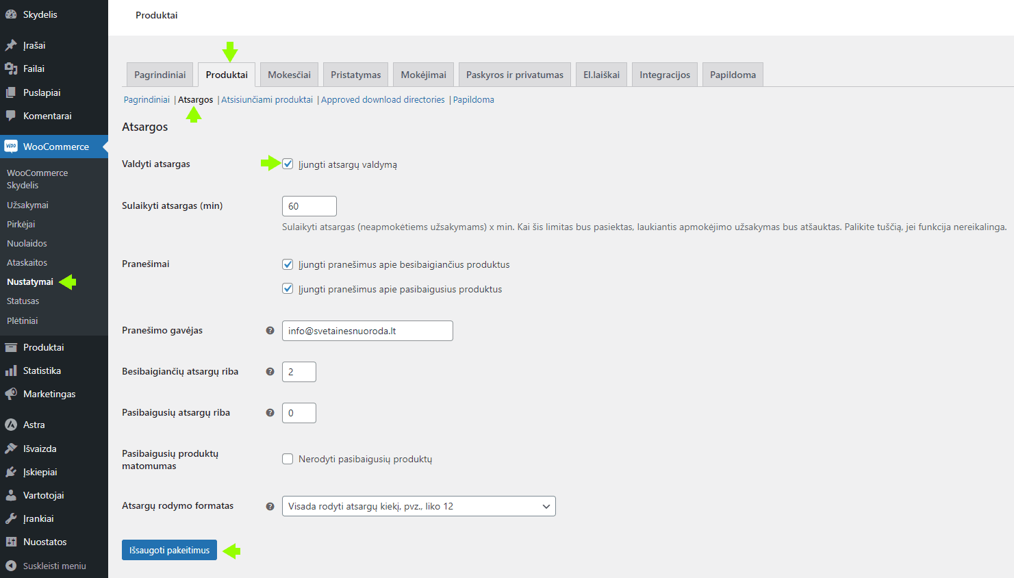 - Valdymo skydelyje eikite į WooCommerce -> Nustatymai.